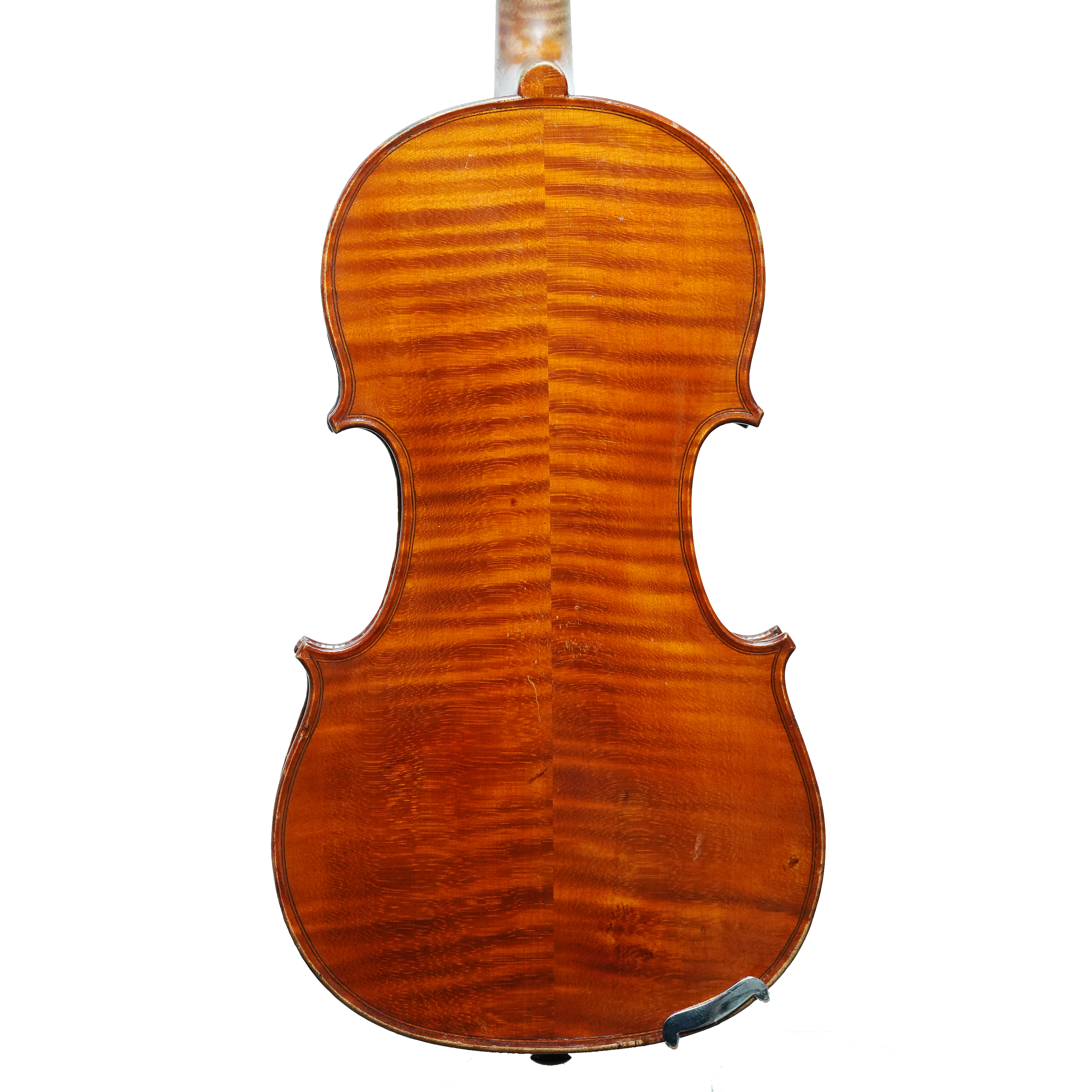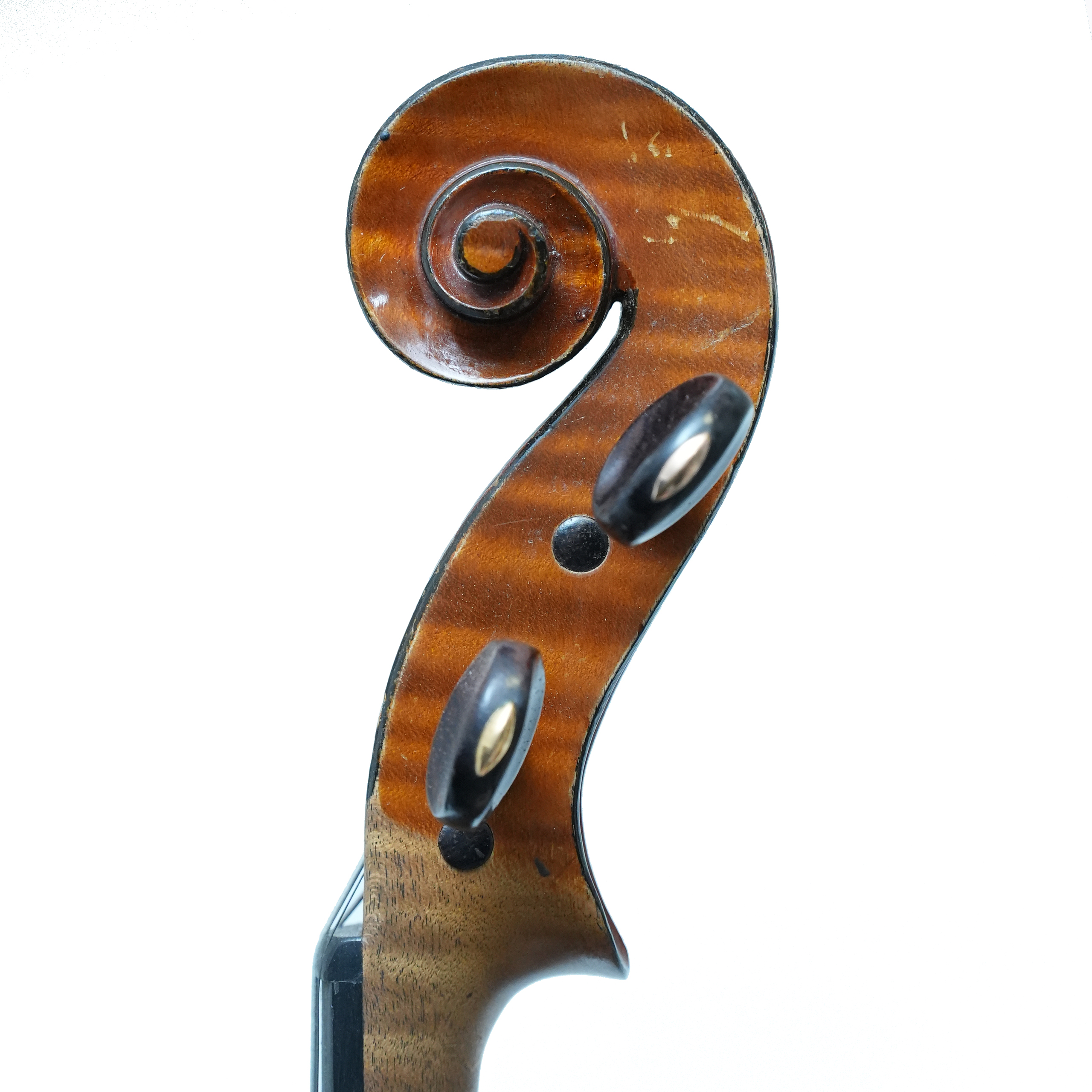 This sonorous old violin is a very nice French violin by Laberte-Humbert frères, made in Mirecourt 1920s. The varnish, with significant traces of use and patina, is an yellow-brown spirit varnish with clear traces of use. The pretty French scroll is carefully crafted. The fine and narrow flaming of the one-piece back is strikingly beautiful. The violin has minor flaws only to the ribs and is preserved in good condition. It is set up and ready to play by our luthiers, as are all violins in our catalog. The powerful sound is mature, clear, brilliant, rich in overtones and radiant, and well balanced overall.